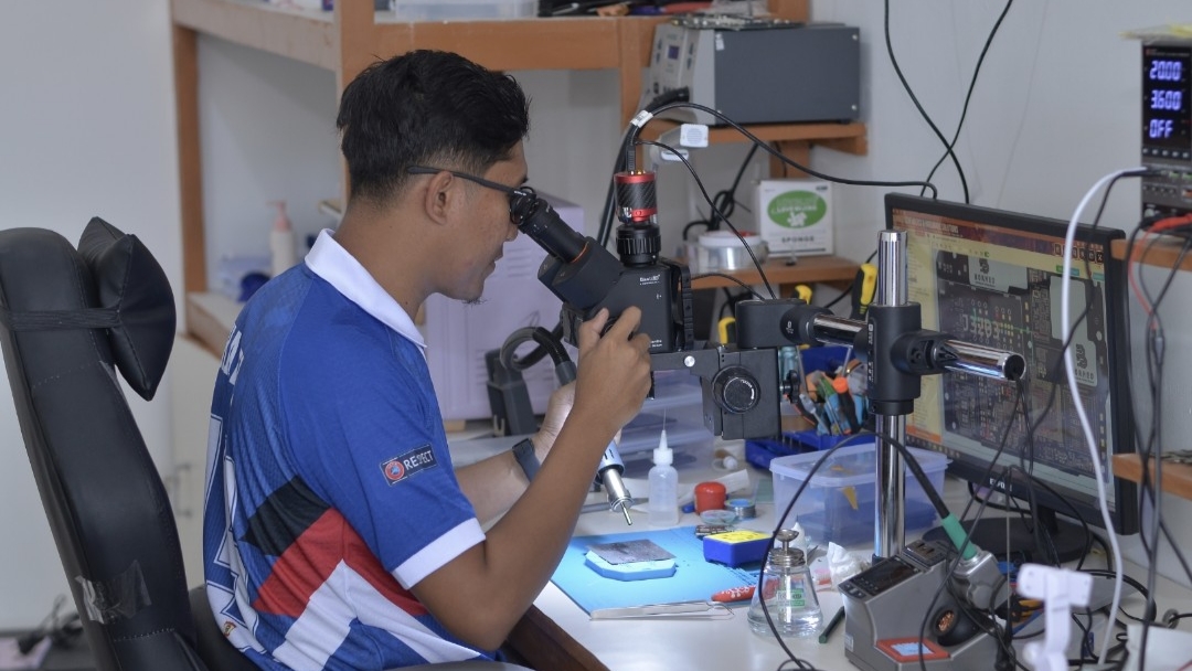 Teknisi Wellcom Solution saat melakukan pengecekan komponen perangkat menggunakan alat khusus untuk memastikan kerusakan terdeteksi secara akurat. (Foto : Lintasharian.com)