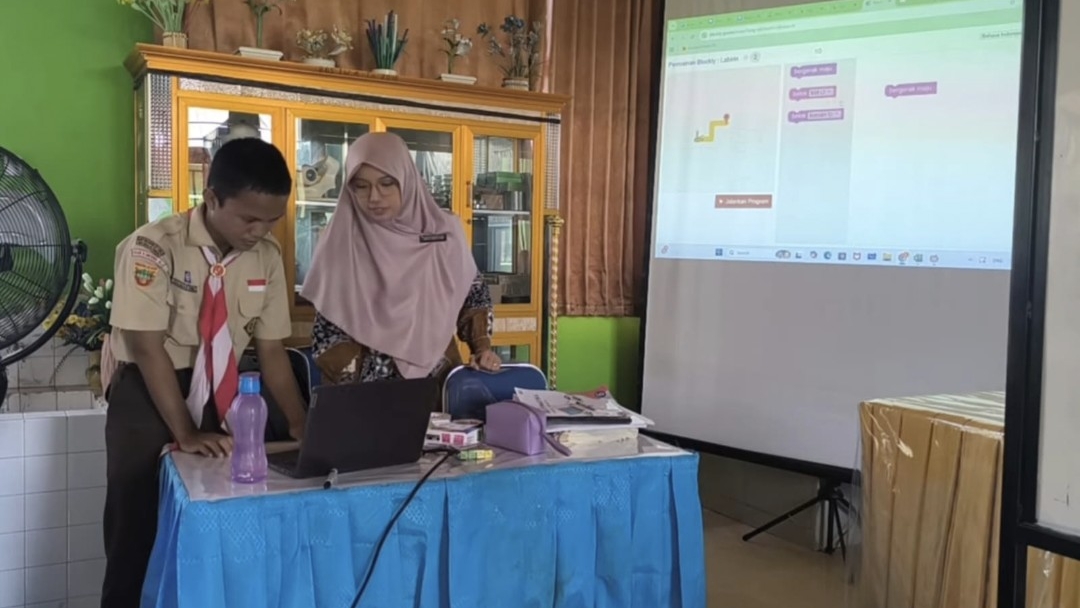Devy Destiani saat mendampingi salah satu siswanya dalam pembelajaran Informatika di SMP Negeri 2 OKU.